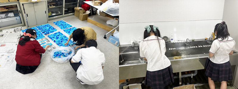 学校祭で1年生がペットボトルアートを行うために、回収したペットボトルキャップを洗浄しました。学校祭後、回収したペットボトルキャップは寄付し、ポリオワクチンを届ける活動に生かします。