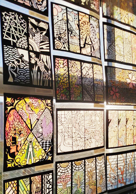 2年生の作品です。7階のエントランスに飾ってあります。ステンドグラス風になっていて、光が当たるととても綺麗です。