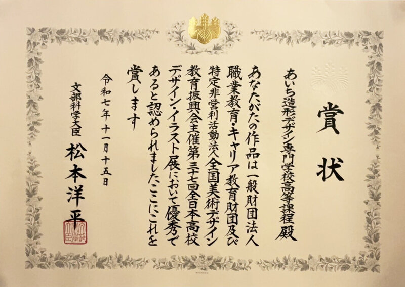 第37回全日本高校デザイン・イラスト展表彰式が東京都三鷹で行われました。団体賞として本校が「文部科学大臣賞」を受賞しました。個人賞は次の通りです。